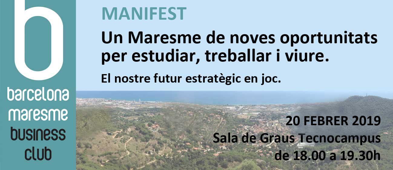 Des del Barcelona Maresme Business Club us convidem a la presentació del manifest, Un Maresme de noves oportunitats per estudiar, treballar i viure. El dia 20 de Febrer a les 18.00 hores, a la Sala de Graus del Tecnocampus (Carrer Ernest Lluc, 32 cantonada Passeig de la Marina).
